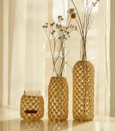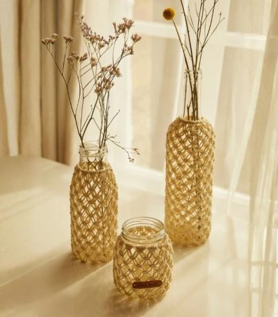 Με μόνο δύο τύπους κόμπων και δύο ώρες ενσυνειδητότητας, μπορείτε να δημιουργήσετε αυτά τα boho καλύμματα για βάζα ή μπουκάλια. Αυτό το κιτ περιλαμβάνει μια μπάλα νήματος Eco Vita 4 και ένα κουβάρι Mouliné Spécial.